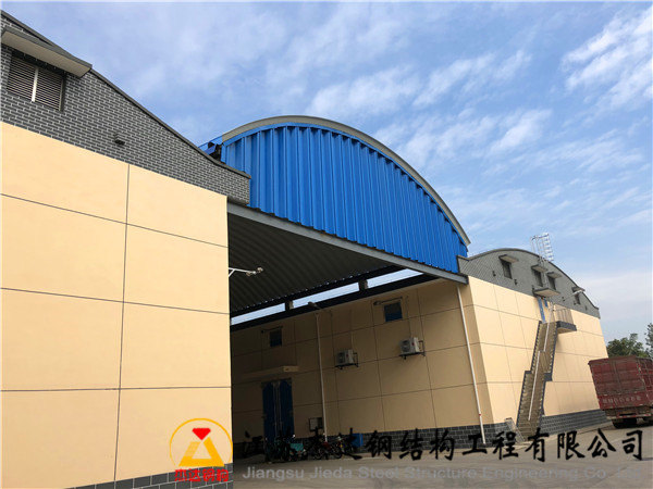 該項(xiàng)目位于江蘇省南京市浦口區(qū)糧食儲備庫內(nèi),罩棚跨度達(dá)16米,長度60米,采用拱形波紋鋼屋蓋結(jié)構(gòu)。結(jié)構(gòu)兩側(cè)設(shè)有250*250H型鋼,上方焊接托板,配合兩側(cè)桁架支撐。桁架外側(cè)覆蓋了通過壓制成型的拱形瓦片,用作山墻,增強(qiáng)整體穩(wěn)定性與美觀度。