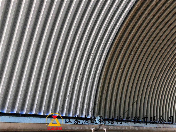 該項目位于江蘇省宿遷市第二糧食儲備庫,原有兩棟拱形屋頂倉間罩棚由湖南某企業(yè)建設(shè),拱高為跨度的四分之一,采用1.0毫米厚的鋼板。由于施工過程中存在偷工減料現(xiàn)象,導(dǎo)致建筑質(zhì)量不達標,屋頂壽命較短,且部分區(qū)域已被臺風(fēng)破壞,半棟屋頂垮塌。現(xiàn)由江蘇杰達鋼結(jié)構(gòu)工程有限公司負責(zé)翻建工作,采用臺灣尚興鋼鐵廠生產(chǎn)的TS280GD-Z彩涂卷,板厚提升至1.2毫米,以增強結(jié)構(gòu)的耐用性和穩(wěn)定性。