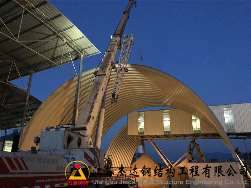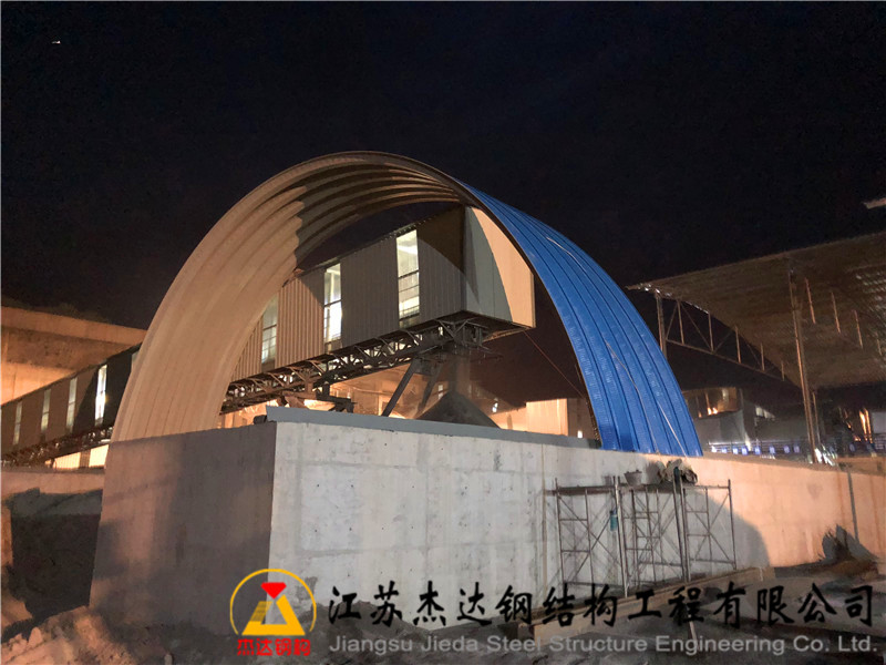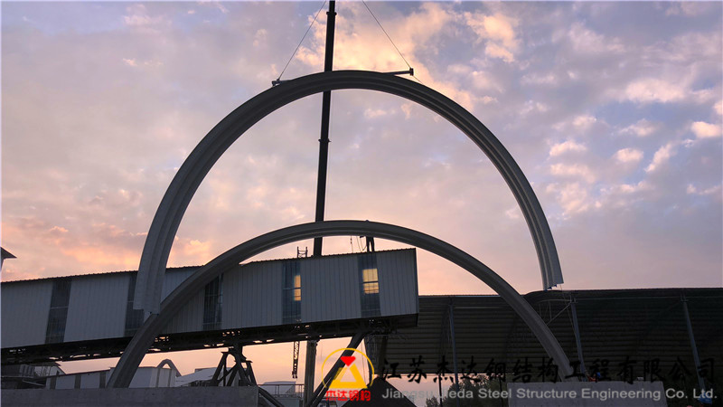 該拱形屋頂跨度約為19米,拱高8米,采用1.2mm厚的鋼板作為屋頂板材,下部連接板厚度為10mm。屋頂結構比例協調,拱高接近跨度的一半,造型優雅,符合礦區環境需求。