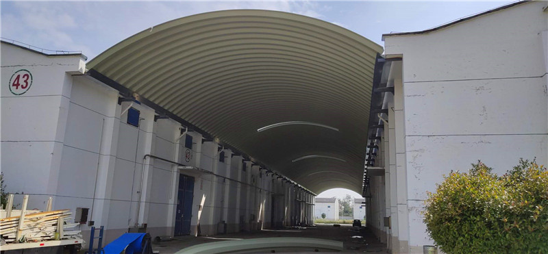 施工完成后的拱形屋頂罩棚整體外觀整潔,結構穩固,采光帶布局合理,為倉儲環境提供了良好的保障。