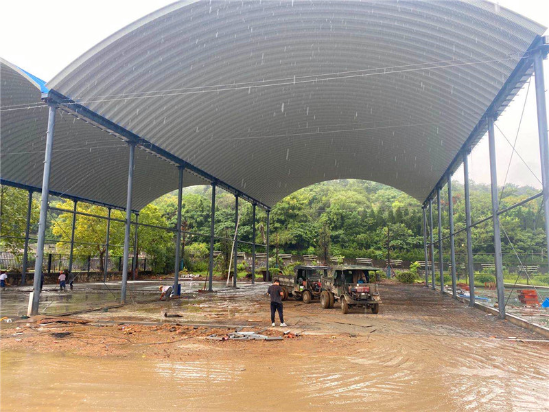 拱形屋頂采用兩連跨設計,跨度達18米,高度約3.6米。盡管施工現(xiàn)場積水較深,但屋頂安裝完成后,施工人員依然能夠在屋頂下正常作業(yè),體現(xiàn)了設計的合理性與施工的專業(yè)性。