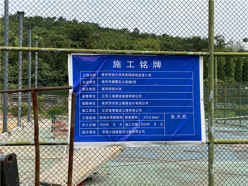 施工銘牌顯示,本次工程位于南京棲霞區(qū)的風雨網(wǎng)球場改造項目,施工單位為江蘇杰達鋼結(jié)構(gòu)工程有限公司,確保施工質(zhì)量符合相關(guān)規(guī)范。